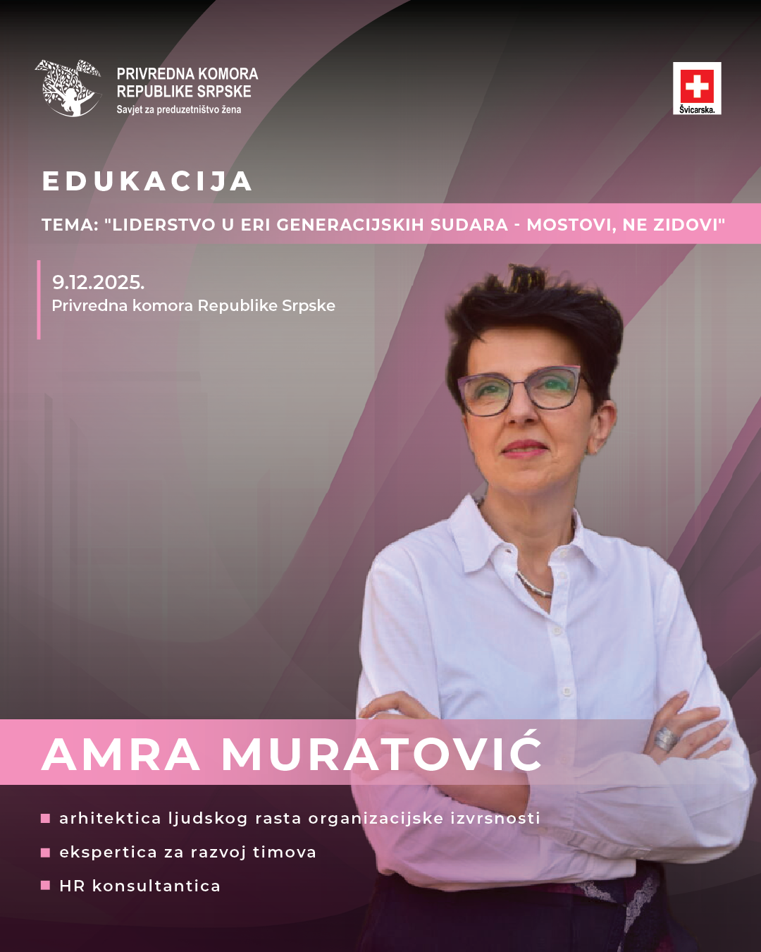 Naime, imajući u vidu dinamično tržište rada, namjera nam je da u utorak, 09.12.2025. godine u Privrednoj komori Republike Srpske (Branka Ćopića br. 6), sa početkom u 11.00 časova, organizujemo edukaciju pod nazivom „Liderstvo u eri generacijskih sudara – mostovi, ne zidovi“.